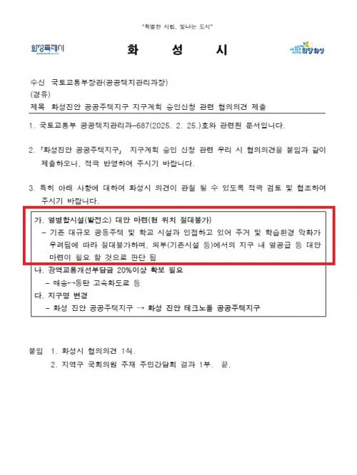 ÀÌ¿Í °ü·ÃÇØ ȼºÆ¯·Ê½Ã´Â ȼºÁø¾È °ø°øÁÖÅÃÁö±¸ ³» ¿º´ÇÕ¹ßÀü½Ã¼³Àº ½Ã¿Í ÇùÀÇ ¾øÀÌ ÁøÇàµÈ »çÇ×À¸·Î, ¡®Çö À§Ä¡ Àý´ë ºÒ°¡¡¯¶ó´Â °·ÂÇÑ ÀÔÀåÀ» ¿©·¯ Â÷·Ê ±¹Åä±³ÅëºÎ ¹× Çѱ¹ÅäÁöÁÖÅðø»ç(LH) Àü´ÞÇßÀ¸¸ç Çö ÀÔÀåÀº Àý´ë ¹Ù²îÁö ¾ÊÀ» °ÍÀ̶ó ¹àÇû´Ù.