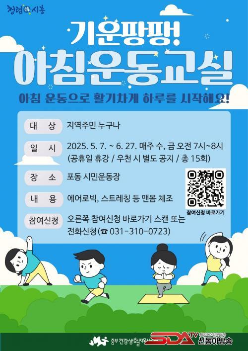 ¡®±â¿î ÆÎÆÎ! ¾ÆÄ§¿îµ¿±³½Ç¡¯Àº Àü¹® °»çÀÇ Áöµµ ¾Æ·¡ ¾ÆÄ§ ¿¡¾î·Îºò ¿îµ¿À» Áß½ÉÀ¸·Î ÁøÇàµÇ¸ç ½Åü À¯¿¬¼º°ú ±Ù·ÂÀ» ³ôÀÌ°í ½ºÆ®·¹½º ÇØ¼Ò¿¡ µµ¿òÀ» ÁÙ ¼ö ÀÖ´Â ³»¿ëÀ¸·Î ÃÑ 15ȸÂ÷·Î ±¸¼ºµÅ ÀÖ´Ù. ½ÃÈï½Ã¹ÎÀ̶ó¸é ´©±¸³ª ¹«·á·Î ÀÚÀ¯·Ó°Ô Âü¿©ÇÒ ¼ö ÀÖÀ¸¸ç, »çÀü ½Åû ¾øÀÌ ÇöÀå¿¡¼µµ ÀÚÀ¯·Ó°Ô Âü¿©ÇÒ ¼ö ÀÖ´Ù.