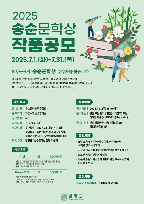 À̹ø ¹®ÇлóÀº Àü±¹ÀÇ Àç´É ÀÖ´Â ½ÃÀε鿡°Ô ¿¸° ±âȸ¸¦ Á¦°øÇϱâ À§ÇØ °ø¸ð·Î ¿î¿µµÇ¸ç, °ø¸ð ºÎ¹®Àº ¡®´ë»ó¡¯°ú ¡®»õ·Î¿î½ÃÀÎ»ó¡¯ 2°³ ºÐ¾ß·Î ±¸¼ºµÇ¸ç, °ø¸ð ±â°£Àº 2025³â 7¿ù 1ÀϺÎÅÍ 7¿ù 31ÀϱîÁö ÇÑ ´Þ°£ÀÌ´Ù.