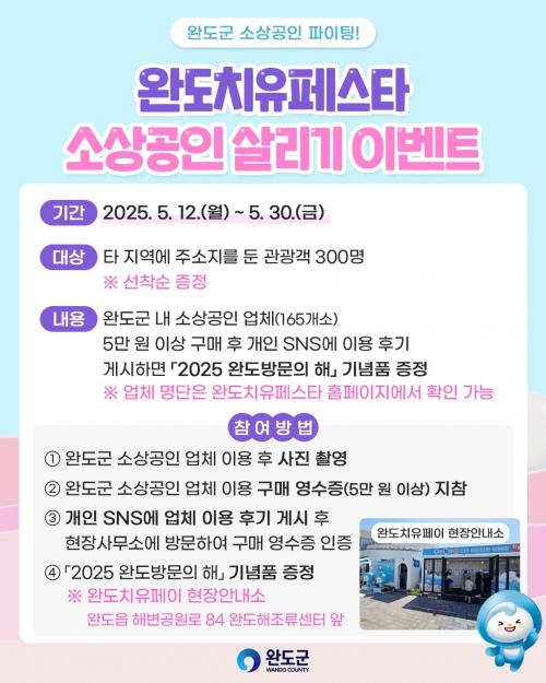 À̺¥Æ® Âü¿© ¹æ¹ýÀº ¿Ïµµ±º ¼Ò»ó°øÀο¬ÇÕȸ ȸ¿ø»ç 165°³ ¾÷ü Áß ÇÑ °÷À» ÀÌ¿ëÇÑ ÈÄ ÀÌ¿ë »çÁø°ú Èı⸦ °³ÀÎ SNS¿¡ °Ô½ÃÇÏ°í ¿Ïµµ Ä¡À¯ Æä½ºÅ¸ ÇöÀå ¾È³»¼Ò¸¦ ¹æ¹®ÇÏ¿© 5¸¸ ¿ø ÀÌ»ó ÀÌ¿ë ¿µ¼öÁõÀ» ÀÎÁõÇÏ¸é ¡®2025 ¿Ïµµ ¹æ¹®ÀÇ ÇØ¡¯ ±â³äǰÀ» ÁõÁ¤ÇÑ´Ù.