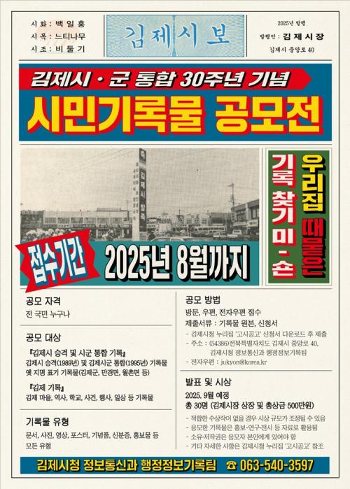 °ø¸ð´ë»óÀº Áö³­ 2000³â ÀÌÀü ±èÁ¦½Ã °ü·Ã ¹Î°£±â·Ï¹°·Î, ƯÈ÷ ±èÁ¦½Ã‧±º ÅëÇÕ 30ÁÖ³âÀ¸·Î½á 1989³â ±èÁ¦½Ã ½Â°Ý°ú 1995³â ±èÁ¦½Ã‧±º ÅëÇÕ °úÁ¤ µî ½ÃÀÇ ¿ª»ç¿Í ¹®È­°¡ ´ã±ä ´Ù¾çÇÑ ÀڷḦ ÁýÁßÀûÀ¸·Î ¼öÁýÇÑ´Ù.