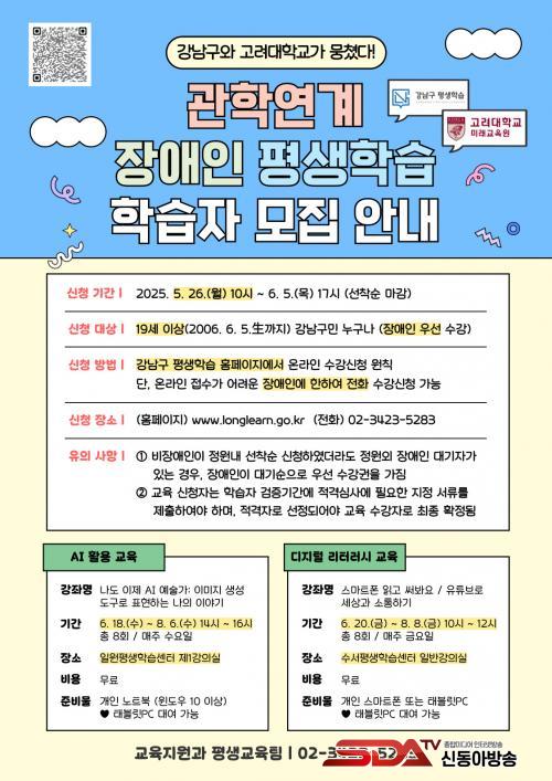 [½Åµ¿¾Æ¹æ¼Û °­³²±¸=À̽ŵ¿±âÀÚ] ²ÞÀÌ ¸ðÀÌ´Â µµ½Ã, ¹Ì·¡¸¦ ±×¸®´Â °­³²±¸°¡ °í·Á´ëÇб³ ¹Ì·¡±³À°¿ø°ú Çù·ÂÇØ ±¸ ÃÖÃÊ·Î Àå¾ÖÀÎÀ» À§ÇÑ Àü¹® Æò»ý±³À° °­Á¸¦ ¿î¿µÇϸç, 5¿ù 26ÀϺÎÅÍ 6¿ù 5ÀϱîÁö Âü¿© ½ÅûÀ» ¹Þ´Â´Ù.