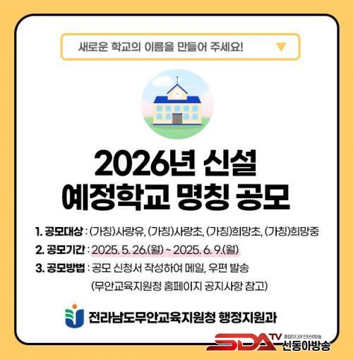 °ø¸ð ±â°£ ³»¿¡ Á¢¼öµÈ ±³¸íÀº 6¿ù Áß ¹«¾È±³À°Áö¿øÃ»¿¡¼ °³ÃÖÇÏ´Â ±³¸í¼±Á¤À§¿øÈ¸ ½ÉÀǸ¦ °ÅÃÄ ¼±Á¤µÇ¸ç, Àü¶ó³²µµ¸³Çб³ ¼³Ä¡Á¶·Ê °³Á¤À» ÅëÇØ ÃÖÁ¾ È®Á¤ÇÒ ¿¹Á¤ÀÌ´Ù.