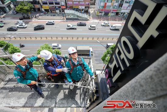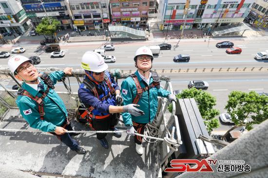À̳¯ ÈÆ·Ã¿¡¼­´Â °í¼ÒÀÛ¾÷´ë Â÷·®À» ÀÌ¿ëÇØ ½ÇÁ¦ 9Ãþ ³ôÀÌ¿¡ ¼³Ä¡µÈ °£ÆÇÀÇ °íÁ¤ »óÅÂ¿Í ºÎ½Ä ¿©ºÎ¸¦ Á¡°ËÇÏ´Â °í°ø ÈÆ·Ãµµ ½Ç½ÃµÆ´Ù.