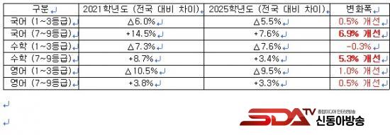 Àü³²Àº Àüü °íµîÇб³ °¡¿îµ¥ À¾¡¤¸é ¼ÒÀç Çб³ÀÇ ºñÁßÀÌ 60% ÀÌ»óÀ¸·Î ³ó¾îÃÌ ÇлýÀÇ ºñÀ²ÀÌ ³ôÀº ÆíÀÌ´Ù. ±×·³¿¡µµ ºÒ±¸Çϰí 2021Çг⵵¿Í 2025Çг⵵ÀÇ ¼ö´É ¼ºÀûÀ» Àü±¹ Æò±Õ°ú ºñ±³ÇÑ °á°ú, Àü³²ÀÇ Çз ¼öÁØÀº Àü¹ÝÀûÀ¸·Î ±àÁ¤ÀûÀÎ º¯È¸¦ º¸¿´´Ù.