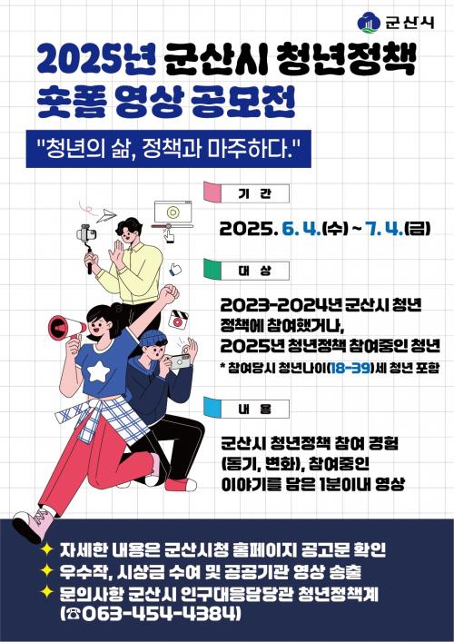 [½Åµ¿¾Æ¹æ¼Û=À̺´½Ä±âÀÚ] ±º»ê½Ã°¡ û³âµéÀÇ ½Ã¼±À¸·Î û³âÁ¤Ã¥ Âü¿© °æÇèÀ» ´ãÀº ÄÜÅÙÃ÷¸¦ ¹ß±¼ÇϰíÀÚ ¡®2025³â ±º»ê½Ã û³âÁ¤Ã¥ ¼ôÆû ¿µ»ó °ø¸ðÀü¡¯À» °³ÃÖÇÑ´Ù.