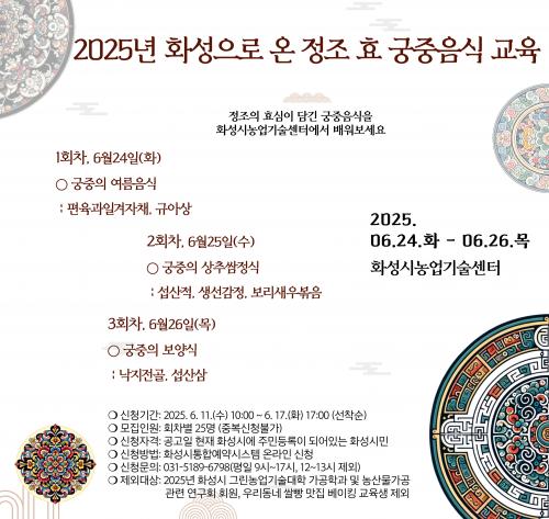 ±³À°Àº ±¹°¡¹«Çü¹®ÈÀç ±ÃÁßÀ½½ÄÀ» Á÷Á¢ ¸¸µé¾îº¸´Â ½Ç½ÀÀ¸·Î ¿î¿µµÇ¸ç, ȸÂ÷º°·Î ¡ã±ÃÁßÀÇ ¿©¸§À½½Ä ¡ã±ÃÁß »óÃß½ÓÁ¤½Ä ¡ã±ÃÁßÀÇ º¸¾ç½Ä µîÀ¸·Î ±¸¼ºµÈ´Ù.