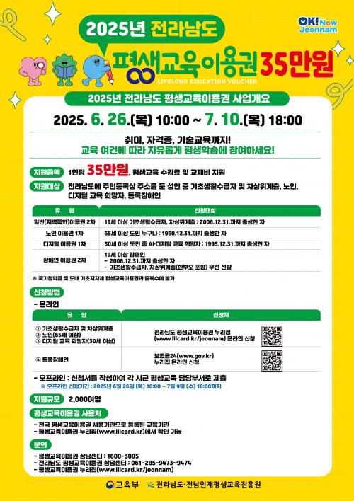 Àú¼ÒµæÃþ, ³ëÀÎ, µðÁöÅÐ ±³À° Èñ¸ÁÀÚ´Â Àü³²µµ Æò»ý±³À°ÀÌ¿ë±Ç ´©¸®Áý(www.lllcard.kr/jeonnam)¿¡¼, Àå¾ÖÀÎÀº º¸Á¶±Ý24(www.gov.kr)¿¡¼ ½ÅûÇÏ¸é µÈ´Ù.