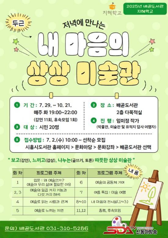 ¡®Àú³á¿¡ ¸¸³ª´Â ³» ¸¶À½ÀÇ »ó»ó¹Ì¼ú°ü¡¯ ÇÁ·Î±×·¥Àº 7¿ù 2ÀÏ ¿ÀÀü 10½ÃºÎÅÍ ½ÃÈï½Ãµµ¼°ü ´©¸®Áý(https://lib.siheung.go.kr)À» ÅëÇØ ¼±Âø¼øÀ¸·Î ½ÅûÇÒ ¼ö ÀÖ´Ù.
