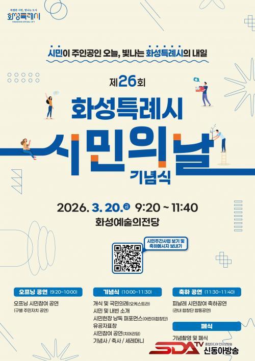 ÇÑÆí, ¡®Á¦26ȸ È­¼ºÆ¯·Ê½Ã¹ÎÀÇ ³¯¡¯ ±â³ä½ÄÀº 3¿ù 20ÀÏ ¿ÀÀü 10½Ã È­¼º¿¹¼úÀÇÀü´ç¿¡¼­ ¿­¸°´Ù. À̹ø ±â³ä½ÄÀº ¡®½Ã¹ÎÀÌ ÁÖÀΰøÀÎ ¿À´Ã, ºû³ª´Â È­¼ºÆ¯·Ê½ÃÀÇ ³»ÀÏ¡¯À̶ó´Â ½½·Î°Ç°ú ÇÔ²² ½Ã¹ÎÀÌ ¹«´ë¸¦ ²Ù¹Ì´Â Âü¿©Çü Çà»ç·Î ÁøÇàµÈ´Ù.