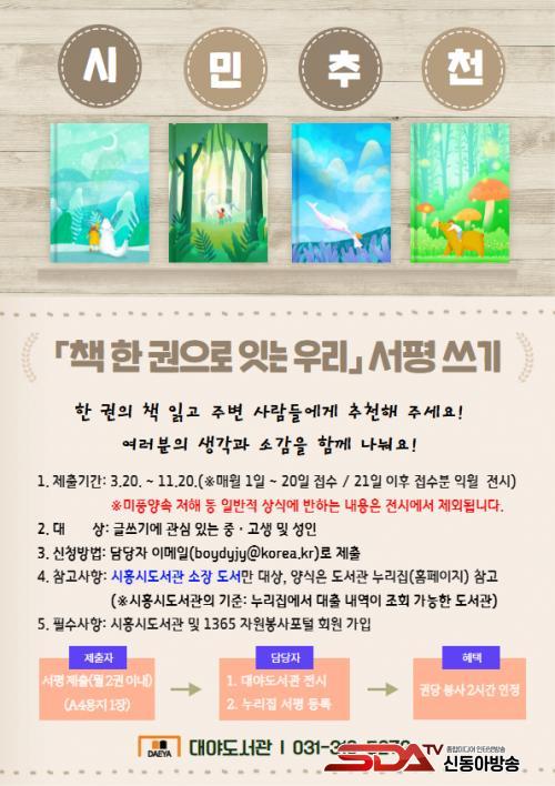 ¼­ÆòÀº 4¿ùºÎÅÍ ¿¬¸»±îÁö ½ÃÈï½Ãµµ¼­°ü ´©¸®Áý¿¡ °Ô½ÃµÇ°í ´ë¾ßµµ¼­°ü ³» Àü½Ã¸¦ ÅëÇØ ½Ã¹Îµé°ú °øÀ¯µÉ ¿¹Á¤ÀÌ´Ù. ¼­Æò Á¦ÃâÀÚ¿¡°Ô´Â ±Ç´ç ÀÚ¿øºÀ»çȰµ¿ 2½Ã°£ÀÌ ÀÎÁ¤µÈ´Ù.