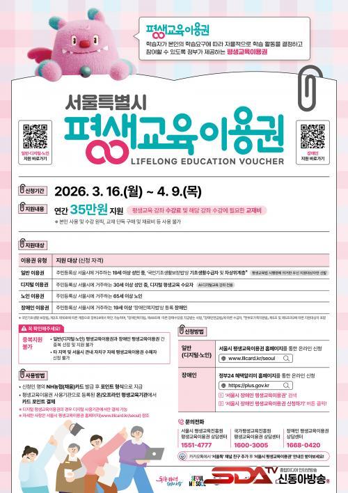½ÅûÀº ºÐ¾ßº°·Î ¿Â¶óÀο¡¼ Á¢¼öÇÒ ¼ö ÀÖ´Ù. ÀϹݡ¤µðÁöÅС¤³ëÀÎ ºÎ¹®Àº ¼¿ï½Ã Æò»ý±³À°ÀÌ¿ë±Ç ´©¸®Áý ¶Ç´Â ¸ð¹ÙÀÏ À¥(www.lllcard.kr/seoul)¿¡¼, Àå¾ÖÀÎ ºÎ¹®Àº Á¤ºÎ24 ÇýÅþ˸®¹Ì ´©¸®Áý ¶Ç´Â ¸ð¹ÙÀÏ À¥(plus.gov.kr)¿¡¼ ½ÅûÇÏ¸é µÈ´Ù. ´Ù¸¸ ¿Â¶óÀÎ ½ÅûÀÌ ¾î·Á¿î °í·ÉÃþ°ú Àå¾ÖÀÎÀÇ ÆíÀǸ¦ °í·ÁÇØ, 65¼¼ ÀÌ»ó ½ÅûÀÚ¿Í Àå¾ÖÀο¡ ÇÑÇØ ÁÖ¼ÒÁö °üÇÒ µ¿Áֹμ¾ÅÍ ÇöÀå Á¢¼öµµ Áö¿øÇÑ´Ù.