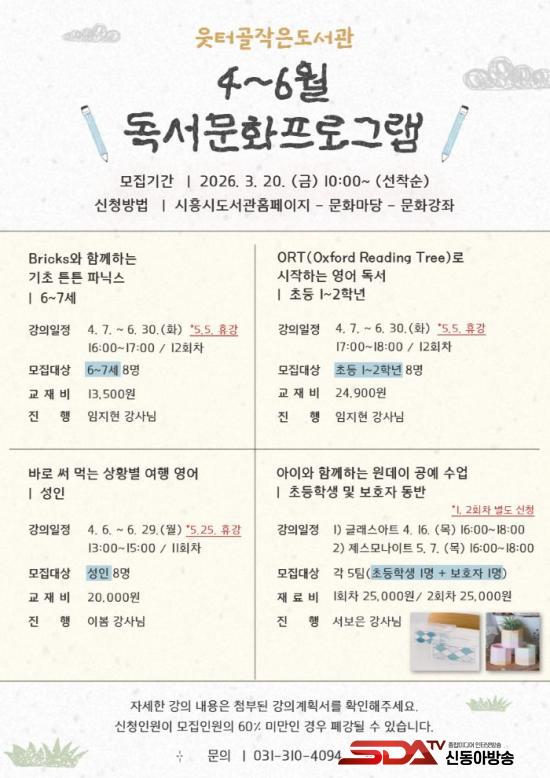 [½Åµ¿¾Æ¹æ¼Û ½ÃÈï½Ã=À̽ŵ¿±âÀÚ] ½ÃÈï½Ã ÀºÇൿ¿¡ ÀÖ´Â ¿ôÅͰñÀÛÀºµµ¼­°üÀº ¿À´Â 4¿ù 6ÀϺÎÅÍ 6¿ù 30ÀϱîÁö ¾à 3°³¿ù°£ »ó¹Ý±â µ¶¼­¹®È­ÇÁ·Î±×·¥À» ¿î¿µÇÑ´Ù.