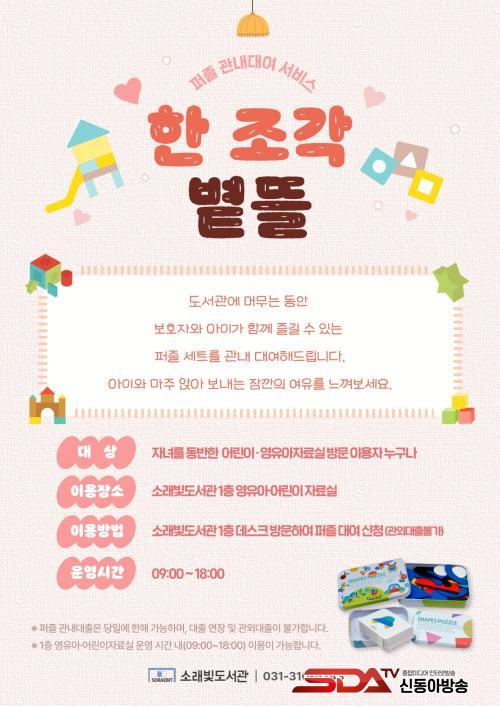 ÆÛÁñÀº ¼Ò·¡ºûµµ¼°ü 1Ãþ ¿µÀ¯¾Æ¤ý¾î¸°ÀÌ ÀÚ·á½Ç¿¡¼ ¿ÀÀü 9½ÃºÎÅÍ ¿ÀÈÄ 6½Ã±îÁö ÀÚÀ¯·Ó°Ô ÀÌ¿ëÇÒ ¼ö ÀÖÀ¸¸ç, Àڳฦ µ¿¹ÝÇÑ ¹æ¹® ÀÌ¿ëÀÚ¶ó¸é ´©±¸³ª Âü¿©ÇÒ ¼ö ÀÖ´Ù. ÀÚ·á½Ç µ¥½ºÅ©¿¡¼ ½ÅûÇÏ¸é ´çÀÏ¿¡¸¸ °ü³»¿¡¼ ÆÛÁñÀ» ´ë¿©ÇØ ÀÌ¿ëÇÒ ¼ö ÀÖ´Ù.
