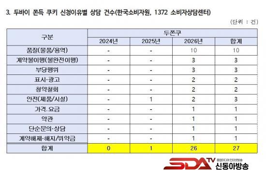 Çѱ¹¼ÒºñÀÚ¿ø 1372 ¼ÒºñÀÚ»ó´ã¼¾ÅÍ Á¢¼ö ÇöȲÀ» º¸¸é 2024³â 0°Ç, 2025³â 1°Ç¿¡ ºÒ°úÇßÀ¸³ª, 2026³â 1¿ù 25°Ç, 2¿ù 1°Ç µî µÎ ´Þ°£ 26°ÇÀÌ Á¢¼öµÆ´Ù. 2024³âºÎÅÍ 2026³â 2¿ù±îÁö ´©Àû 27°Ç °¡¿îµ¥ 26°Ç(¾à 96%)ÀÌ 2026³â¿¡ ÁýÁßµÅ, ¿ÃÇØ µé¾î ¼ÒºñÀÚ ºÒ¸¸ÀÌ º»°ÝÀûÀ¸·Î Ç¥¸éÈµÈ °ÍÀ¸·Î ºÐ¼®µÈ´Ù.