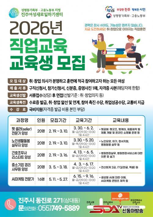 [½Åµ¿¾Æ¹æ¼Û °æ³²ÁøÁÖ=³²±Ã¿µ±â±âÀÚ] ÁøÁÖ¿©¼º»õ·ÎÀÏÇϱ⼾ÅÍ´Â °æ·Â´ÜÀý ¿©¼ºÀÇ Ãë¾÷ ¿ª·®À» °­È­ÇÏ°í ¼º°øÀûÀÎ »çȸ ÁøÃâÀ» Áö¿øÇϱâ À§ÇØ ¡®2026³â Á÷¾÷±³À°ÈƷᯠ±³À°»ý ¸ðÁý¿¡ ³ª¼¹´Ù.