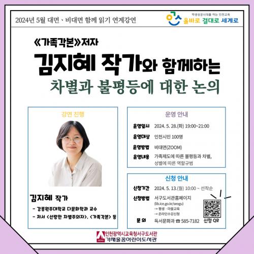 [½Åµ¿¾Æ¹æ¼Û ÀÎõ= À±¹Î½Ä±âÀÚ] ÀÎõ±¤¿ª½Ã±³À°Ã»¼­±¸µµ¼­°ü(°üÀå ¹ÚÁ¤Èñ)Àº 5¿ù ¡¸´ë¸é¡¤ºñ´ë¸é ÇÔ²² Àб⡹ ¿¬°è °­¿¬À¸·Î ¡®°¡Á·°¢º»¡¯ ±èÁöÇý ÀúÀÚ °­¿¬À» 28ÀÏ ¿î¿µÇÑ´Ù. ±èÁöÇý ÀÛ°¡´Â Çö °­¸ª¿øÁÖ´ëÇб³ ´Ù¹®È­Çаú ±³¼ö·Î ¡®¼±·®ÇÑ Â÷º°ÁÖÀÇÀÚ¡¯, ¡®°¡Á·°¢¡¦
