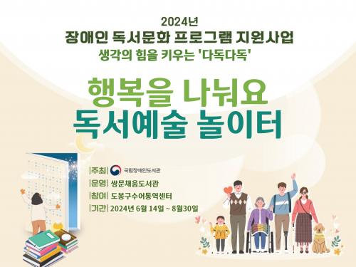 [½Åµ¿¾Æ¹æ¼Û µµºÀ±¸=À̽ŵ¿±âÀÚ]µµºÀ±¸ µµºÀ¹®È­Àç´Ü ½Ö¹®Ã¤¿òµµ¼­°üÀÌ ±¹¸³Àå¾ÖÀεµ¼­°ü ÁÖ°ü ¡®2024³â Àå¾ÖÀÎ µ¶¼­¹®È­ÇÁ·Î±×·¥»ç¾÷¡¯¿¡ ¼±Á¤µÆ´Ù. ¡®2024³â Àå¾ÖÀÎ µ¶¼­¹®È­ÇÁ·Î±×·¥»ç¾÷¡¯Àº Àü±¹ µµ¼­°ü ¹× Ư¼öÇб³¸¦ ±â¹ÝÀ¸·Î ÇÑ Àå¾ÖÀ¯Çüº° µ¶¼­¹®È­ÇÁ·Î±×·¥À¸¡¦