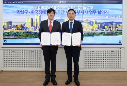 [½Åµ¿¾Æ¹æ¼Û °­³²±¸=À̽ŵ¿±âÀÚ]°­³²±¸°¡ 16ÀÏ ±¸Ã»¿¡¼­ Çѱ¹Àå¾ÖÀΰí¿ë°ø´Ü ¼­¿ïµ¿ºÎÁö»ç(Áö»çÀå ±è´ë±Ô)¿Í ¡®±â¾÷ÀÇ ESG °æ¿µ°ú Àå¾ÖÀÎ ÀÏÀÚ¸® È®´ë¸¦ À§ÇÑ ¾÷¹« Çù¾à¡¯À» ü°áÇß´Ù. À̹ø Çù¾àÀ» ÅëÇØ ¾ç ±â°üÀº ±â¾÷ÀÇ ESG °æ¿µ Ȱ¼ºÈ­¸¦ ÅëÇÑ Áö¿ª ³» Àå¾ÖÀÎ ÀÏÀÚ¡¦