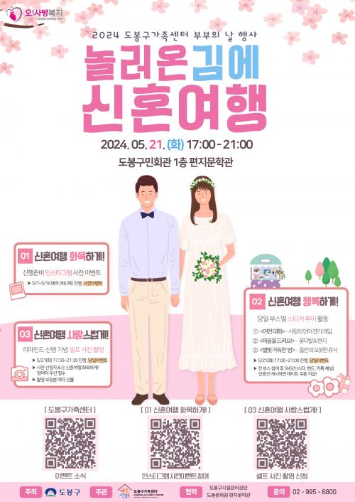 [½Åµ¿¾Æ¹æ¼Û µµºÀ±¸=À̽ŵ¿±âÀÚ]µµºÀ±¸°¡ ºÎºÎÀÇ ³¯À» ±â³äÇØ ¿À´Â 5¿ù 21ÀÏ ¿ÀÈÄ 5½ÃºÎÅÍ 9½Ã±îÁö µµºÀ±¸¹Îȸ°ü ÆíÁö¹®Çаü¿¡¼­ ¡®³î·¯ ¿Â ±è¿¡ ½ÅÈ¥¿©Ç࡯ Çà»ç¸¦ °³ÃÖÇÑ´Ù. µµºÀ±¸°¡Á·¼¾ÅÍ(¼¾ÅÍÀå °­Áø¾Æ) ÁÖ°üÀ¸·Î ÁøÇàµÇ´Â À̹ø Çà»ç´Â ºÎºÎ°¡ ÇѸ¶À½À¸·Î Áñ±æ¡¦