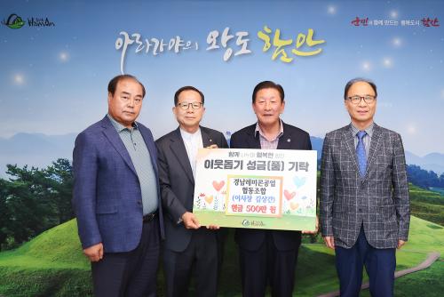 [½Åµ¿¾Æ¹æ¼Û ÇÔ¾È=À̽ŵ¿±âÀÚ]°æ³²·¹¹ÌÄܰø¾÷Çùµ¿Á¶ÇÕ(ÀÌ»çÀå ±è»ó°£)Àº 22ÀÏ ¾î·Á¿î ÀÌ¿ôÀ» µ½±â À§ÇÑ ¼º±Ý 500¸¸ ¿øÀ» ÇԾȱº¿¡ ±âŹÇß´Ù. À̳¯ ±âŹ½Ä¿¡´Â Á¶±ÙÁ¦ ÇԾȱº¼ö¿Í °æ³²·¹¹ÌÄܰø¾÷Çùµ¿Á¶ÇÕ ±è»ó°£ ÀÌ»çÀå, ¾çÀç±Ô Àü¹« ¿Ü °ü°èÀÚ°¡ Âü¼®ÇßÀ¸¸ç, ±âŹµÈ¡¦