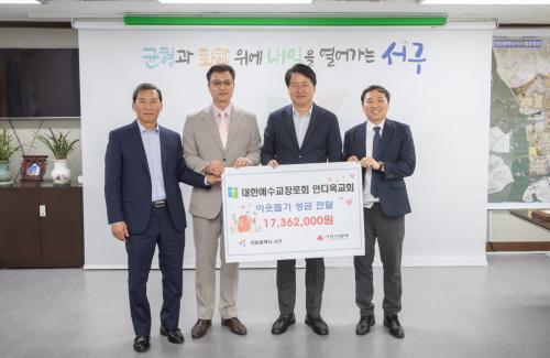 [½Åµ¿¾Æ¹æ¼Û ÀÎõ= À±¹Î½Ä±âÀÚ]ÀÎõ ¼­±¸(±¸Ã»Àå °­¹ü¼®)´Â 5¿ù 24ÀÏ, ´ëÇÑ¿¹¼ö±³Àå·Îȸ ¾Èµð¿Á±³È¸(¹ÚÁÖÇå ´ãÀÓ¸ñ»ç)·ÎºÎÅÍ ÀÌ¿ô»ç¶û ¼º±Ý 17,362,000¿øÀ» Àü´Þ¹Þ¾Ò´Ù°í ¹àÇû´Ù. ´ëÇÑ¿¹¼ö±³Àå·Îȸ ¾Èµð¿Á±³È¸´Â ²ÙÁØÈ÷ ¼­±¸ Áö¿ªÀ» À§ÇØ ±âºÎ¸¦ ÇØ¿À´Â °÷À¸·Î, ¡¦