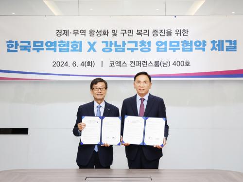 [½Åµ¿¾Æ¹æ¼Û °­³²±¸=À̽ŵ¿±âÀÚ]°­³²±¸°¡ 4ÀÏ ÄÚ¿¢½º¿¡¼­ (»ç)Çѱ¹¹«¿ªÇùȸ(ȸÀå À±Áø½Ä)¿Í °æÁ¦¡¤¹«¿ª Ȱ¼ºÈ­ ¹× ±¸¹Î º¹¸® ÁõÁøÀ» À§ÇÑ ¾÷¹« Çù¾àÀ» ü°áÇß´Ù. ÁÖ¿ä Çù¾à ³»¿ëÀº Áß¼Ò±â¾÷ ÇØ¿Ü¸¶ÄÉÆÃ ¹× ¿ì¼ö ½ºÅ¸Æ®¾÷ Áö¿ø, ±Û·Î¹ú ¹«¿ªÀü¹®°¡ ¾ç¼º, ¸¶À̽º°ü±¤ Ȱ¡¦