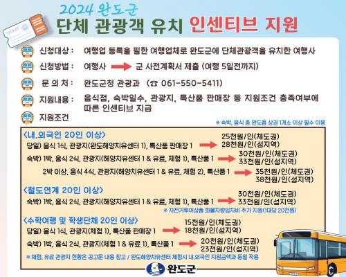 [½Åµ¿¾Æ¹æ¼Û=¿Ïµµ À̼±Á¾ ±âÀÚ] ¿Ïµµ±º(±º¼ö ½Å¿ìö)Àº 20¸í ÀÌ»ó ³»¿Ü±¹ÀÎ ´Üü °ü±¤°´À» À¯Ä¡ÇÏ´Â ¿©Çà»ç¿¡ Áö¿øÇÏ´Â Àμ¾Æ¼ºê¸¦ È®´ëÇÑ´Ù. Áö¿ø ´ë»óÀº ¿©Çà¾÷À¸·Î µî·ÏµÈ ¿©Çà ¾÷ü·Î ¿Ïµµ±º¿¡ ´Üü °ü±¤°´À» À¯Ä¡ÇÑ ¿©Çà»ç°¡ ÇØ¾çÄ¡À¯¼¾ÅÍ¿Í À½½ÄÁ¡, ¼÷¹Ú¡¦