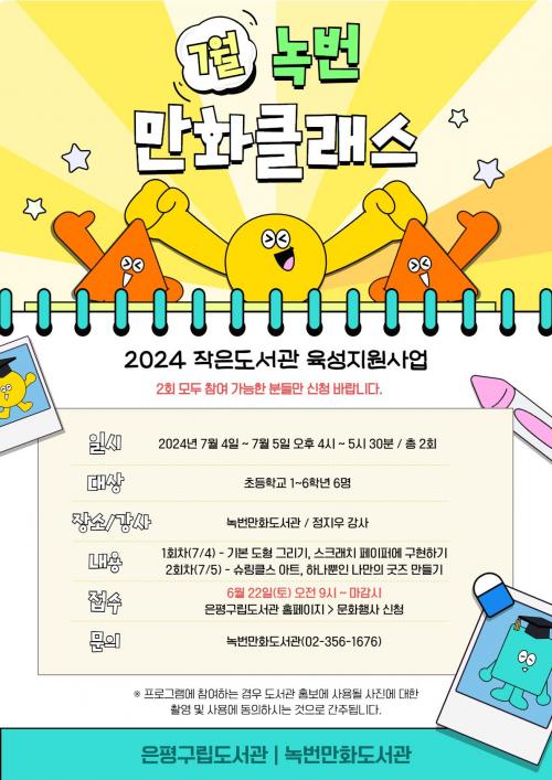 [½Åµ¿¾Æ¹æ¼Û ÀºÆò±¸=À̽ŵ¿±âÀÚ]ÀºÆò±¸(±¸Ã»Àå ±è¹Ì°æ)´Â ³ì¹ø¸¸È­µµ¼­°üÀÌ ¡®2024 ÀÛÀºµµ¼­°ü À°¼ºÁö¿ø»ç¾÷¡¯¿¡ ¼±Á¤µÅ ¡®³ì¹ø ¸¸È­Å¬·¡½º¡¯¸¦ ÁøÇàÇÑ´Ù°í ¹àÇû´Ù. ÀÛÀºµµ¼­°ü À°¼ºÁö¿ø»ç¾÷Àº ¼­¿ï½Ã¿¡¼­ Áö¿øÇϸç, ÀÚÄ¡±¸ °ø»ç¸³ ÀÛÀºµµ¼­°ü Ȱ¼ºÈ­¸¦ ÅëÇØ Áö¿ªÁֹΡ¦