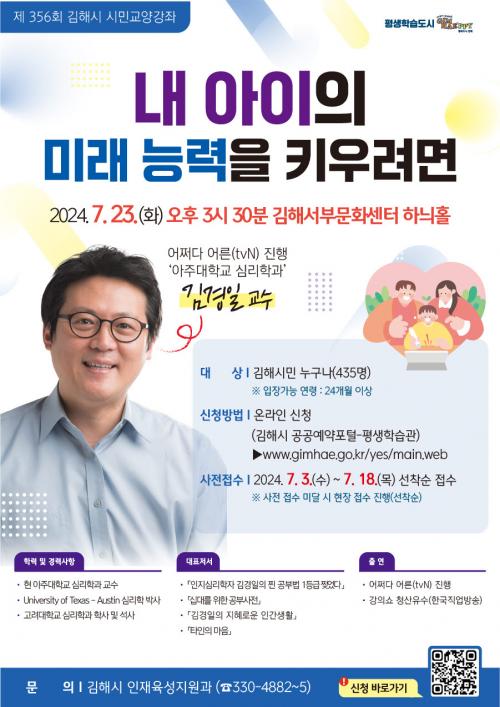 [½Åµ¿¾Æ¹æ¼Û´º½º=·ù¸®Áö±âÀÚ] ±èÇØ½Ã´Â ¿À´Â 23ÀÏ ¿ÀÈÄ 3½Ã 30ºÐ ±èÇØ¼­ºÎ¹®È­¼¾ÅÍ ÇÏ´ÌȦ¿¡¼­ tvN ¡®¾î¼´Ù ¾î¸¥¡¯ ÁøÇàÀڷΠȰ¾àÇϰí ÀÖ´Â ¾ÆÁÖ´ëÇб³ ½É¸®Çаú ±è°æÀÏ ±³¼ö¸¦ ÃÊÃ»ÇØ ¡®Á¦356ȸ ½Ã¹Î±³¾ç°­Á¡¯¸¦ °³ÃÖÇÑ´Ù. ¾ÆÀ̸¦ ¿Ã¹Ù¸£°Ô Ű¿ì´Â À°¾Æ ¹æ¹ý¿¡ ´ë¡¦