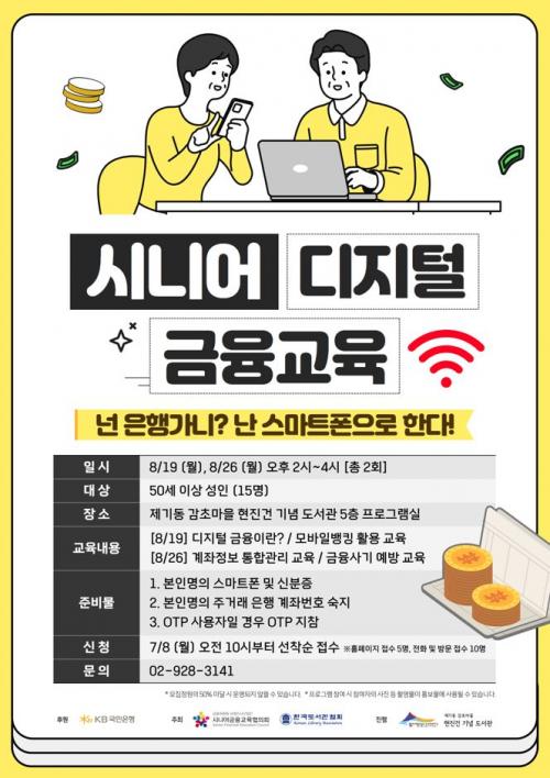 [½Åµ¿¾Æ¹æ¼Û µ¿´ë¹®=À̽ŵ¿±âÀÚ]µ¿´ë¹®¹®È­Àç´Ü(´ëÇ¥ÀÌ»ç ±è°æ¿í)Àº 8¿ù ÇöÁø°Ç ±â³ä µµ¼­°ü(Á¦±âµ¿ °¨Ãʸ¶À»)¿¡¼­ ¡®½Ã´Ï¾î µðÁöÅÐ ±ÝÀ¶ ±³À°¡¯À» ½Ç½ÃÇÑ´Ù°í ¹àÇû´Ù. (»ç)½Ã´Ï¾î±ÝÀ¶±³À°ÇùÀÇȸ¿Í Çѱ¹µµ¼­°üÇùȸ°¡ ÁÖÃÖÇϰí KB±¹¹ÎÀºÇàÀÌ ÈÄ¿øÇÏ´Â À̹ø °­Á´ 1Â÷¡¦
