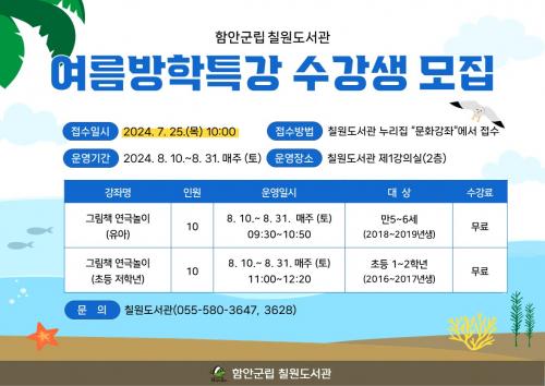 [½Åµ¿¾Æ¹æ¼Û ÇԾȱº=À̽ŵ¿±âÀÚ]ÇԾȱº¸³ Ä¥¿øµµ¼­°üÀº ¿À´Â 25ÀϺÎÅÍ °ü³» À¯¾Æ ¹× Ãʵî ÀúÇгâÀ» ´ë»óÀ¸·Î 2024³â ¿©¸§Æ¯°­ ¼ö°­»ýÀ» ¸ðÁýÇÑ´Ù. °³¼³ °­Á´ ±×¸²Ã¥ ¼Ó ´Ù¾çÇÑ ¿¬±ØÀû Ç¥Çö³îÀÌ·Î ±×¸²Ã¥ÀÌ ÁÖ´Â Áñ°Å¿òÀ» ´À³¢°í ÀڽۨÀ» ÁõÁø½ÃŰ´Â ¡®±×¸²Ã¥ ¿¬¡¦