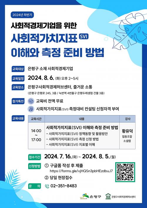 [½Åµ¿¾Æ¹æ¼Û=À̽ŵ¿±âÀÚ] ÀºÆò±¸(±¸Ã»Àå ±è¹Ì°æ)´Â ³»´Þ 6ÀÏ ¿ÀÈÄ 2½Ã ÀºÆò±¸ »çȸÀû°æÁ¦ÀûÇãºê¼¾ÅÍ¿¡¼­ »çȸÀû°æÁ¦±â¾÷À» ´ë»óÀ¸·Î ¡®2024³â ÇϹݱ⠻çȸÀû°¡Ä¡ÁöÇ¥ ÀÌÇØ¿Í ÃøÁ¤ Áغñ¡¯ ±³À°À» ½Ç½ÃÇÑ´Ù°í ¹àÇû´Ù. »çȸÀû°¡Ä¡ÁöÇ¥(Social Value Index : SVI)´Â »çȸ¡¦