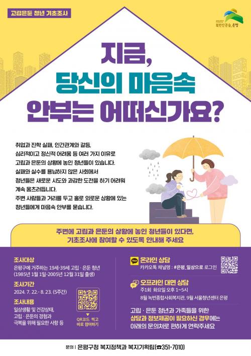 [½Åµ¿¾Æ¹æ¼Û=À̽ŵ¿±âÀÚ] ÀºÆò±¸(±¸Ã»Àå ±è¹Ì°æ)´Â °í¸³°ú ÀºµÐÀÇ ¾î·Á¿òÀ» °Þ°í ÀÖ´Â °ü³» 19¼¼ºÎÅÍ 39¼¼±îÁö ÀºµÐÇü¿ÜÅçÀÌ Ã»³â ¹ß±¼À» À§ÇØ ±âÃÊÁ¶»ç¿Í ¿Â‧¿ÀÇÁ¶óÀÎ »ó´ãÀ» ÃßÁøÇÑ´Ù°í ¹àÇû´Ù. ¡®ÀºµÐÇü¿ÜÅçÀÌ ±âÃÊÁ¶»ç¡¯´Â û³âµéÀÇ ÀÏ»ó»ýȰ°ú °í¸³, ÀºµÐ¡¦
