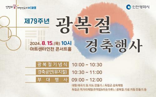 [½Åµ¿¾Æ¹æ¼Û ÀÎõ= À±¹Î½Ä±âÀÚ] ÀÎõ±¤¿ª½Ã°¡ ¿À´Ã 8¿ù 15ÀÏ ¾ÆÆ®¼¾ÅÍÀÎõ Äܼ­Æ®È¦¿¡¼­ Á¦79Áֳ⠱¤º¹ÀýÀ» °æÃàÇϱâ À§ÇÑ Çà»ç¸¦ °³ÃÖÇÑ´Ù°í 5ÀÏ ¹àÇû´Ù. À̹ø °æÃà½Ä¿¡´Â µ¶¸³À¯°øÀÚ À¯Á·, º¸ÈÆ´ÜüÀå, Áö¿ª ±¹È¸ÀÇ¿ø ¹× ±â°ü¡¤´ÜüÀå, ½ÃÀÇ¿ø µî ÁÖ¿ä Àλç¿Í ½Ã¹Î¡¦
