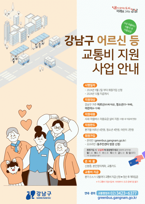 [½Åµ¿¾Æ¹æ¼Û=À̽ŵ¿±âÀÚ]²ÞÀÌ ¸ðÀÌ´Â µµ½Ã, ¹Ì·¡¸¦ ±×¸®´Â °­³²±¸(±¸Ã»Àå Á¶¼º¸í)°¡ ¿À´Â 9¿ù 2ÀϺÎÅÍ Àü¿ë ȨÆäÀÌÁö¿Í Áֹμ¾ÅÍ¿¡¼­ ¾î¸£½Å¡¤Ã»¼Ò³â¡¤¾î¸°ÀÌ ´ë»ó ¹ö½º¿ä±Ý Áö¿ø»ç¾÷ Á¢¼ö¸¦ ½ÃÀÛÇÑ´Ù. ÀÌ »ç¾÷Àº °­³²±¸¿¡ Áֹεî·ÏÀ» µÎ°í ÀÖ´Â 65¼¼ ÀÌ»ó ¾î¸£½Å°ú¡¦
