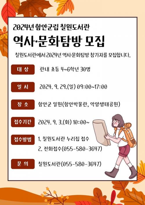 [½Åµ¿¾Æ¹æ¼Û=À̽ŵ¿±âÀÚ]ÇԾȱº¸³ Ä¥¿øµµ¼­°üÀº °ü³» ÃʵîÇлý 4~6ÇгâÀ» ´ë»óÀ¸·Î ÇÏ´Â ¡®2024³â ¿ª»ç¡¤¹®È­Å½¹æ¡¯ ÇÁ·Î±×·¥ Âü°¡ÀÚ¸¦ ¿À´Â 9¿ù 3ÀÏ(È­)ºÎÅÍ ¸ðÁýÇÑ´Ù°í ¹àÇû´Ù. ޹æÀº ¿À´Â 9¿ù 29ÀÏ(ÀÏ)¿¡ ÁøÇàÇÏ¸ç ¿ÀÀü¿¡´Â ¹®È­Çؼ³»çÀÇ ¾È³»·Î ÇԾȹڹ°°ü°ú¡¦
