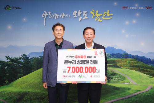 [½Åµ¿¾Æ¹æ¼Û=À̽ŵ¿±âÀÚ] ÇԾȱºÀº 2ÀÏ BNK°æ³²ÀºÇà ÇÔ¾ÈÁöÁ¡ »ç¶û³ª´®Àç´Ü¿¡¼­ Ãß¼®À» ¸ÂÀÌÇØ Àú¼ÒµæÃþ¿¡°Ô ¿Â´©¸®»óǰ±Ç 700¸¸ ¿øÀ» Áö¿øÇß´Ù°í ¹àÇû´Ù. À̳¯ ±º¼ö½Ç¿¡¼­ ¿­¸° ±âŹ½Ä¿¡´Â Á¶±ÙÁ¦ ÇԾȱº¼ö¿Í BNK°æ³²ÀºÇà ÇÔ¾ÈÁöÁ¡ ±èÁ¤ÈÆ ÁöÁ¡Àå, ÀüµæÇ¥ ºÎÁöÁ¡À塦