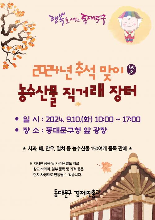 [½Åµ¿¾Æ¹æ¼Û=À̽ŵ¿±âÀÚ] ¼­¿ï µ¿´ë¹®±¸ ±¸Ã»Àå ÀÌÇÊÇüÀº 9¿ù 10ÀÏ(È­) ¿ÀÀü 10½ÃºÎÅÍ ¿ÀÈÄ 5½Ã±îÁö ±¸Ã» ¾Õ ±¤Àå¿¡¼­ ¡®2024³â Ãß¼®¸ÂÀÌ ³ó¼ö»ê¹° Á÷°Å·¡ ÀåÅÍ¡¯¸¦ ¿î¿µÇÑ´Ù°í 4ÀÏ ¹àÇû´Ù. ¿ÃÇØ Ãß¼® ÀåÅÍ¿¡´Â µ¿´ë¹®±¸¿Í °á¿¬À» ¸ÎÀº ³²Çرº ¡¤ ³ªÁֽà ¡¤ Ãáõ½Ã µî¡¦