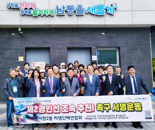 ÀÎõ½Ã ³²µ¿±¸ ¼­Ã¢2µ¿ ÇàÁ¤º¹Áö¼¾ÅÍ(µ¿Àå ÀÓÈñÁ¤)´Â ¼­Ã¢2µ¿ ÀÚ»ý´Üü¿¬ÇÕȸ¿¡¼­ ¡®Á¦2°æÀμ± Á¶¼Ó ÃßÁø Ã˱¸ ¼­¸í¿îµ¿¡¯À» ÁøÇàÇß´Ù°í 21ÀÏ ¹àÇû´Ù. Á¦2°æÀμ±Àº ¿¬¼ö±¸ ûÇпªÀ» ±âÁ¡À¸·Î ³²µ¿±¸ ³íÇö, ¼­Ã¢À» °ÅÃÄ ¼­¿ï·Î À̾îÁö´Â ±¤¿ªÃ¶µµ·Î °³Åë ¶§ Áö¿ªÁֹΡ¦