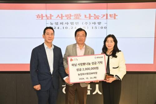 [½Åµ¿¾Æ¹æ¼Û Çϳ²½Ã=À̽ŵ¿±âÀÚ] Áö³­ 24ÀÏ ³ó»ê¹° ±Þ½Ä ³³Ç°¾÷üÀÎ ³ó¾÷ȸ»ç¹ýÀ΢߾ƶû(´ëÇ¥ ±èâ¿ë)ÀÌ Çϳ²½Ã¿¡ ¼º±Ý 200¸¸¿øÀ» ±âŹÇϰí À̸¦ ±â³äÇϱâ À§ÇØ ±âʽÄÀ» °¡Á³´Ù. À̳¯ ±âŹ½Ä¿¡´Â ÀÌÇöÀç Çϳ²½ÃÀåÀ» ºñ·ÔÇÏ¿© ³ó¾÷ȸ»ç¹ýÀ΢߾ƶû ±èâ¿ë ´ëÇ¥, ±èÀºÁ¤¡¦