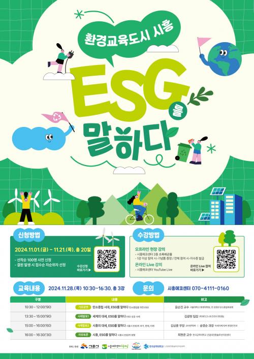 [½Åµ¿¾Æ¹æ¼Û ½ÃÈï½Ã=À̽ŵ¿±âÀÚ] ȯ°æ±³À°µµ½Ã ½ÃÈï½Ã´Â 11¿ù 28ÀÏ ½ÃÈï¿¡ÄÚ¼¾ÅÍ¿¡¼­ ¡®È¯°æ±³À°µµ½Ã ½ÃÈï, ESG¸¦ ¸»ÇÏ´Ù¡¯ °­ÀǸ¦ °³ÃÖÇÑ´Ù. ½Ã´Â ȯ°æºÎ·ÎºÎÅÍ ¡®È¯°æ±³À°µµ½Ã¡¯·Î ÁöÁ¤µÅ 2024³âºÎÅÍ 2026³â±îÁö 3³â°£, ȯ°æ±³À° Àü¹® Àη ¾ç¼º, Áö¿ªÈ¯°æ Çб³ ±³¡¦