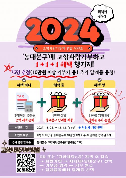 [½Åµ¿¾Æ¹æ¼Û µ¿´ë¹®±¸=À̽ŵ¿±âÀÚ] ¼­¿ï µ¿´ë¹®±¸´Â ¿¬¸»À» ¸Â¾Æ °íÇâ»ç¶û±âºÎÁ¦¸¦ È«º¸ÇÏ°í °ÇÀüÇÑ ±âºÎ¹®È­¸¦ Á¶¼ºÇϱâ À§ÇØ 11. 25.(¿ù)ºÎÅÍ 12. 13.(±Ý)±îÁö 3ÁÖ µ¿¾È ¡®Ãß°¡ ÁõÁ¤ À̺¥Æ®¡¯¸¦ ½Ç½ÃÇÑ´Ù°í ¹àÇû´Ù. À̺¥Æ® ±â°£ Áß µ¿´ë¹®±¸¿¡ °íÇâ»ç¶û±âºÎ±ÝÀ» º¸¡¦