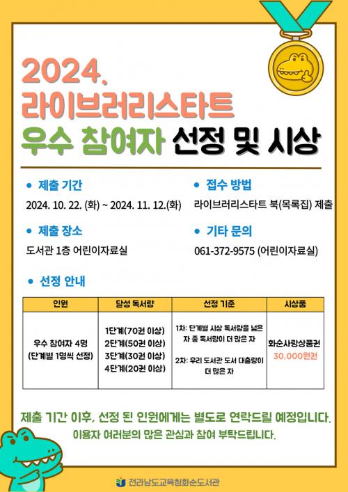 [½Åµ¿¾Æ¹æ¼Û Àü³²È­¼ø=À̽ŵ¿±âÀÚ] Àü¶ó³²µµ±³À°Ã»È­¼øµµ¼­°üÀº 2024³â 11¿ù 28ÀÏ(¸ñ)¿¡ '2024³â ¶óÀ̺귯¸® ½ºÅ¸Æ®' ÇÁ·Î±×·¥ÀÇ ´Ü°èº° ¿ì¼ö Âü¿©ÀÚ¸¦ ½Ã»óÇß´Ù. '¶óÀ̺귯¸® ½ºÅ¸Æ®'´Â ¾î¸°ÀÌ¿Í Ã»¼Ò³âÀÇ µ¶¼­ ½À°ü Çü¼º°ú µ¶¼­ ¹®È­¸¦ È®»êÇϱâ À§ÇØ È­¼øµµ¼­°üÀÌ¡¦