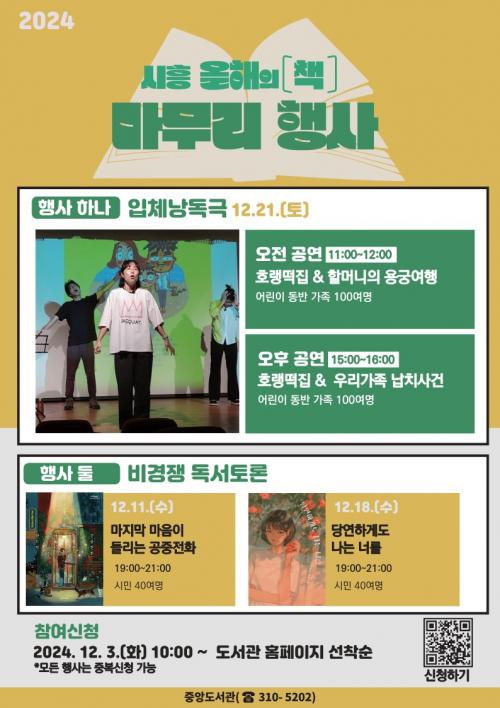 [½Åµ¿¾Æ¹æ¼Û ½ÃÈï½Ã=À̽ŵ¿±âÀÚ] ½ÃÈï½ÃÁß¾Óµµ¼­°üÀº ÇÑ ÇØ¸¦ ¸¶¹«¸®ÇÏ´Â ½ÃÁ¡¿¡ ½Ã¹ÎµéÀÌ ¡®2024 ½ÃÈï ¿ÃÇØÀÇ Ã¥¡¯°ú ¿¬°èÇØ ´Ù¾çÇÑ µ¶¼­ °æÇèÀ» ³ª´©°í ¹®È­¸¦ üÇèÇÒ ¼ö ÀÖ´Â Çà»ç¸¦ ¸¶·ÃÇß´Ù. 12¿ù 11Àϰú 18ÀÏ µÎ Â÷·Ê¿¡ °ÉÃÄ Ã¹ ¹øÂ° Çà»ç·Î ¡®ºñ°æÀï µ¶¼­Åä·Ð¡¦