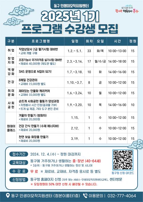 ÀÎõ µ¿±¸ ÀλýÀ̸ðÀÛÁö¿ø¼¾ÅÍ, 2025³â 1±â ÇÁ·Î±×·¥ ¼ö°­»ý ¸ðÁý