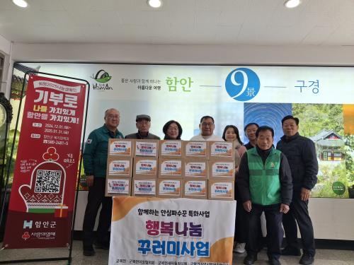 [½Åµ¿¾Æ¹æ¼Û Àü³²ÇÔ¾È=À̽ŵ¿±âÀÚ] ÇԾȱº ±ººÏ¸é°ú ¾È½ÉÆÄ¼ö²Û »ç¾÷ Çù¾àÀ» ü°áÇÑ 3°³ ¹Î°£´Üü(±ººÏ¸é Áö¿ª»çȸº¸ÀåÇùÀÇü¡¤ÀÌÀåÇùÀÇȸ¡¤»õ¸¶À»ÇùÀÇȸ)´Â 19ÀÏ °ü³» Ãë¾à°èÃþ 63°¡±¸¿¡ Çູ ³ª´® ²Ù·¯¹Ì¸¦ Àü´ÞÇÏ´Â »ç¾÷À» ½Ç½ÃÇß´Ù. À̹ø Áö¿ø »ç¾÷Àº µÈÀå, °íÃß¡¦