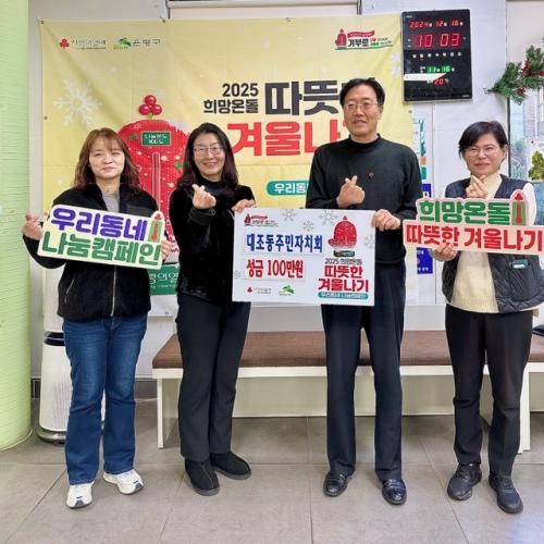 [½Åµ¿¾Æ¹æ¼Û ÀºÆò±¸=À̽ŵ¿±âÀÚ] ÀºÆò±¸ ´ëÁ¶µ¿Àº Áö³­ 16ÀÏ ÁÖ¹ÎÀÚġȸ°¡ Èñ¸Á¿Âµ¹ µû¶æÇÑ °Ü¿ï³ª±â ¼º±Ý 1¹é¸¸ ¿øÀ» ±âºÎÇß´Ù°í ¹àÇû´Ù. ´ëÁ¶µ¿ ÁÖ¹ÎÀÚġȸ´Â 2024³â Âü¿©¿¹»ê µ¿ Áö¿ª »ç¾÷ ¡®¾Æ³ª¹Ù´Ù ³ª´®ÀåÅÍ¡¯¸¦ ÅëÇÑ »ç¾÷¼öÀͱݰú ÁÖ¹ÎÀÚġȸ À§¿øÀÇ ±âºÎ±ÝÀ¸¡¦
