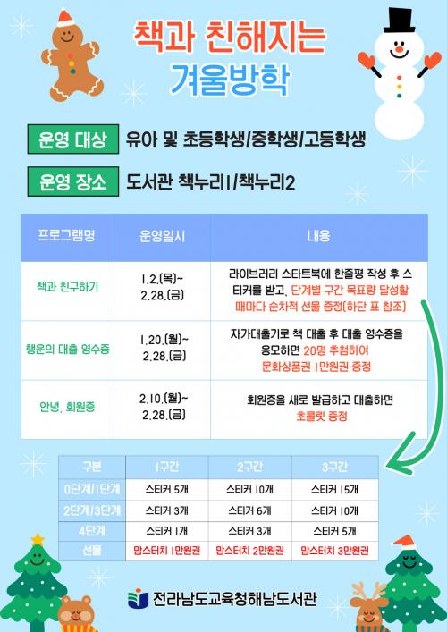 [½Åµ¿¾Æ¹æ¼Û Àü³²Çس²=À̽ŵ¿±âÀÚ] Àü¶ó³²µµ±³À°Ã»Çس²µµ¼­°üÀº ¹æÇÐÀ» ¸ÂÀÌÇÏ¿© 1.2.(¸ñ)ºÎÅÍ 2.28.(±Ý)±îÁö ¡®Ã¥°ú Ä£ÇØÁö´Â °Ü¿ï¹æÇС¯À» ¿î¿µÇÑ´Ù. À̹ø Çà»ç´Â À¯¡¤ÃÊ¡¤ÁßÇлýµéÀ» ´ë»óÀ¸·Î ¿î¿µµÇ¸ç, Ã¥°ú Ä£ÇØÁö±â, Çà¿îÀÇ ´ëÃâ ¿µ¼öÁõ, ¾È³ç, ȸ¿øÁõ µîÀ¸·Î¡¦