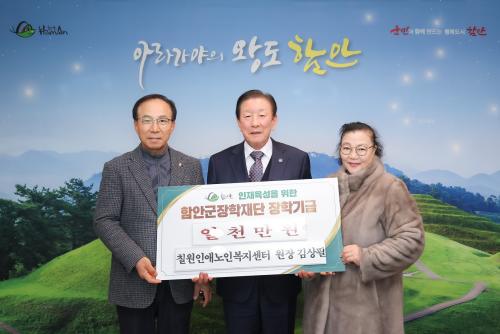 [½Åµ¿¾Æ¹æ¼Û °æ³²ÇÔ¾È=À̽ŵ¿±âÀÚ] ÇԾȱºÀº Ä¥¿øÀξֳëÀκ¹Áö¼¾ÅÍ ±è»óÇÊ ¿øÀåÀÌ Áö¿ªÀÎÀçÀ°¼ºÀ» À§ÇÑ ÀåÇбâ±Ý 1000¸¸ ¿øÀ» ±º ÀåÇÐÀç´Ü¿¡ ±âŹÇß´Ù°í 30ÀÏ ¹àÇû´Ù. ±âŹ½Ä¿¡´Â ±è»óÇÊ ¿øÀå°ú ±è±âÈ­ ¼¾ÅÍÀåÀÌ Âü¼®ÇØ Áö¿ªÀÇ ±³À° ¹ßÀü°ú ÀÎÀç¾ç¼ºÀ» À§ÇÑ ¶æÀ» Àü¡¦